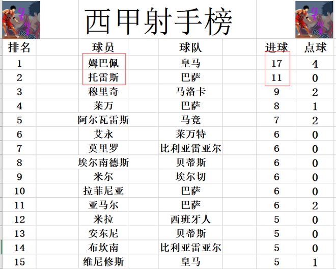 射手榜方面,姆巴佩今天打入一球,17球繼續(xù)高居榜首,將和托雷斯的差距拉大到6球。穆里奇9球排在第3,萊萬8球位列第4。維尼修斯今天未能進球,還是差1球才能追上拉菲尼亞,亞馬爾等人擠入前十。