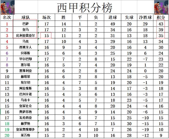 積分榜方面,皇馬險勝贏球后還不算徹底崩盤,還是差巴薩4分暫時位列第2。比利亞雷亞爾少賽2場,落后皇馬4分位列第3,他們差的2場若都能贏球,就會將皇馬擠出前2。畢爾巴鄂競技客場完敗無力追趕黑馬西班牙人,多賽一場還落后西班牙人7分,要想爭5的話難度很大。